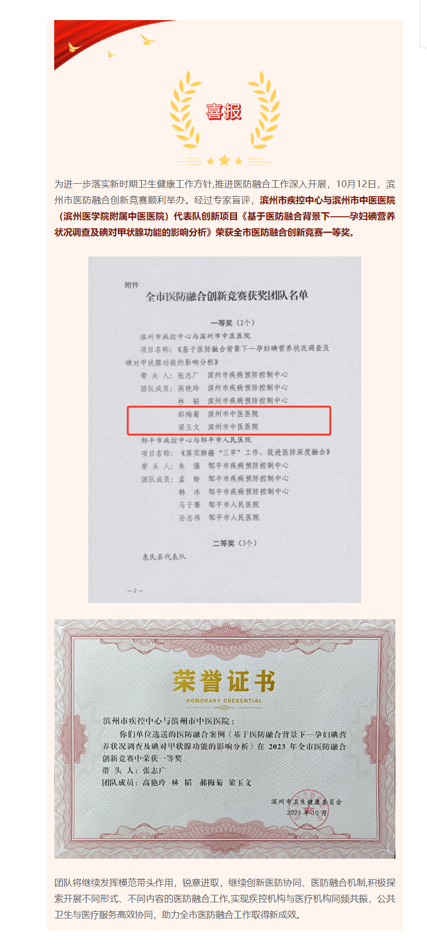 喜报 | 滨州市疾控中心与滨州市中医医院(滨州医学院附属中医医院)代表队在全市医防融合创新竞赛中荣获一等奖