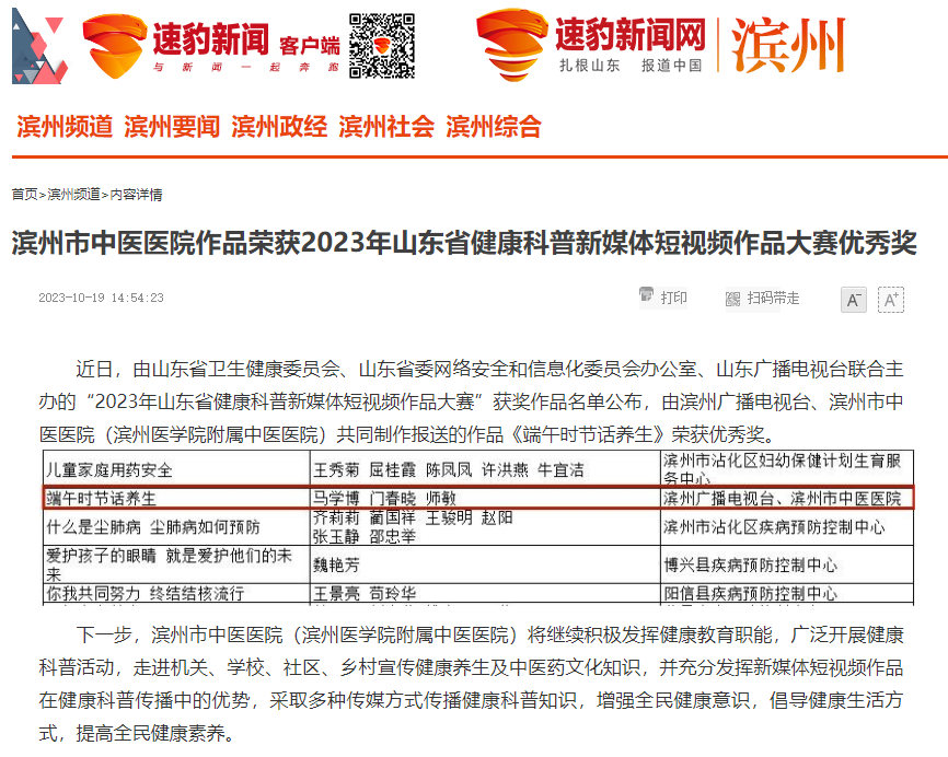 【速豹新闻网】滨州市中医医院作品荣获2023年山东省健康科普新媒体短视频作品大赛优秀奖
