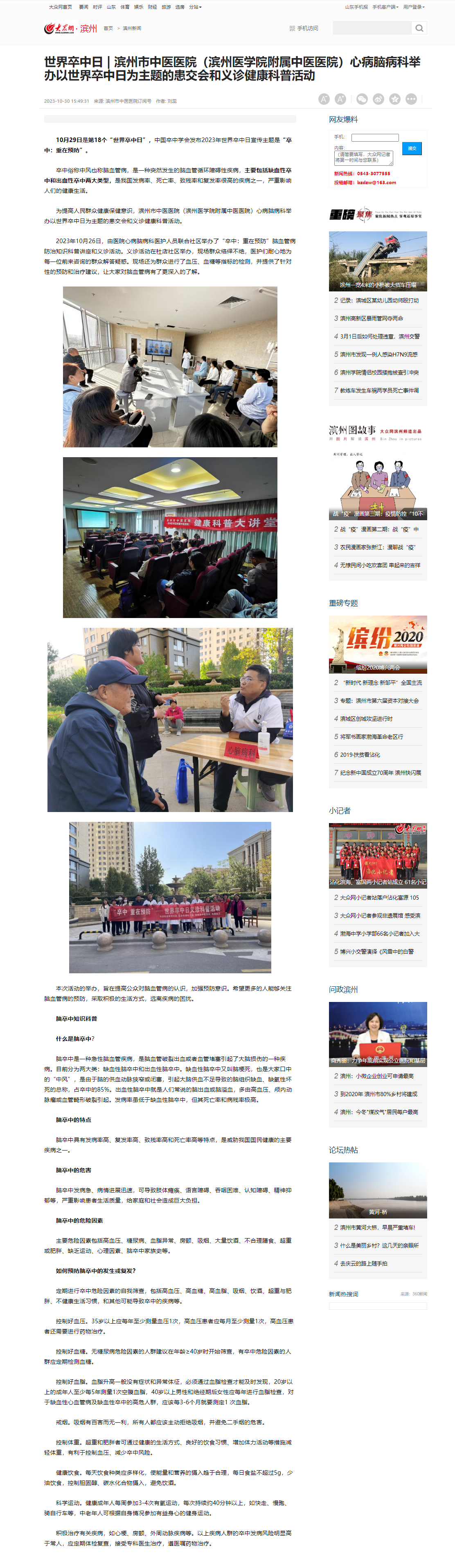 【大众网】世界卒中日 | 滨州市中医医院(滨州医学院附属中医医院)心病脑病科举办以世界卒中日为主题的患交会和义诊健康科普活动