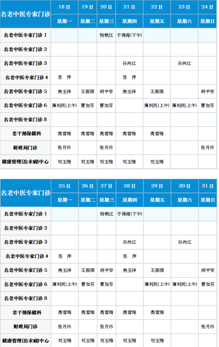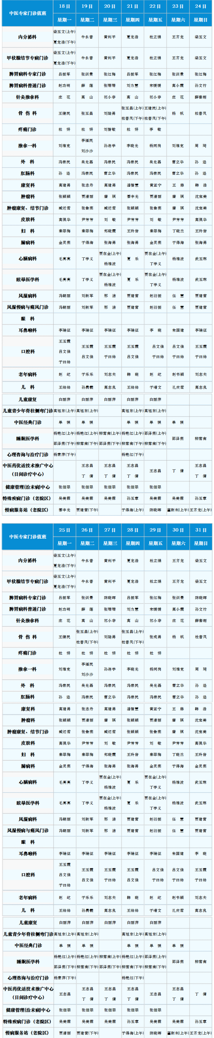 中医专家门诊值班表