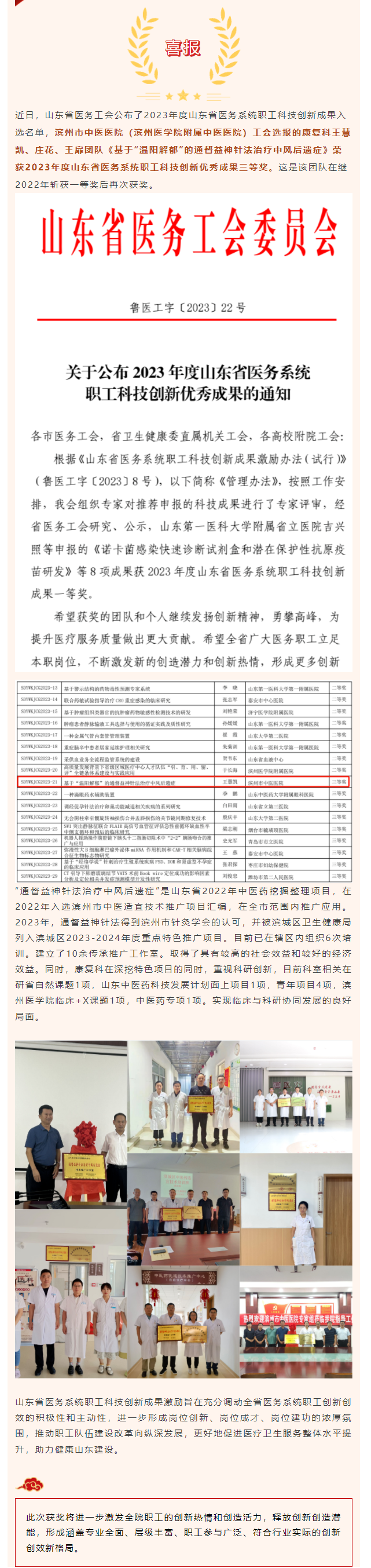 喜报 | 滨州市中医医院(滨州医学院附属中医医院)康复科团队《基于“温阳解郁”的通督益神针法治疗中风后遗症》获科技创新成果三等奖