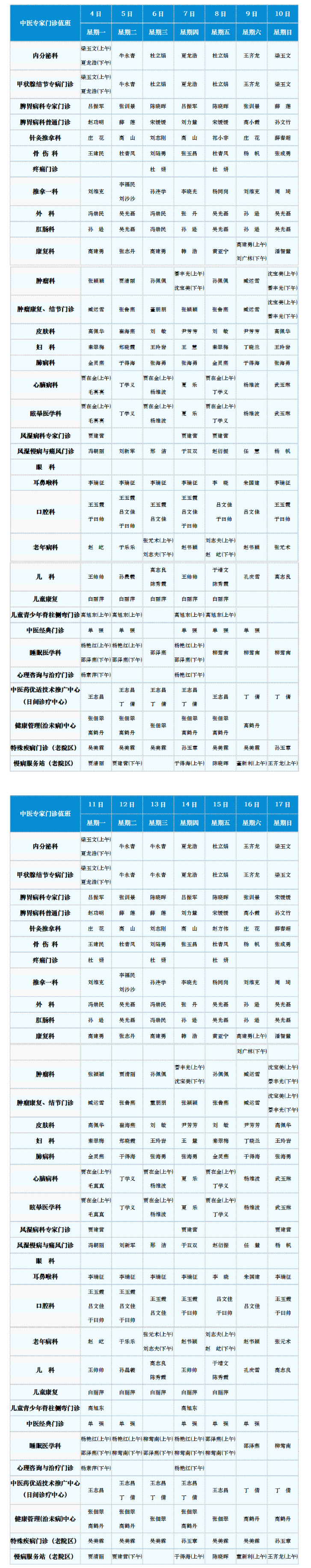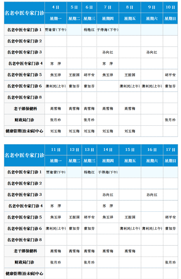 中医专家门诊值班表