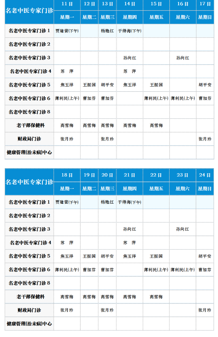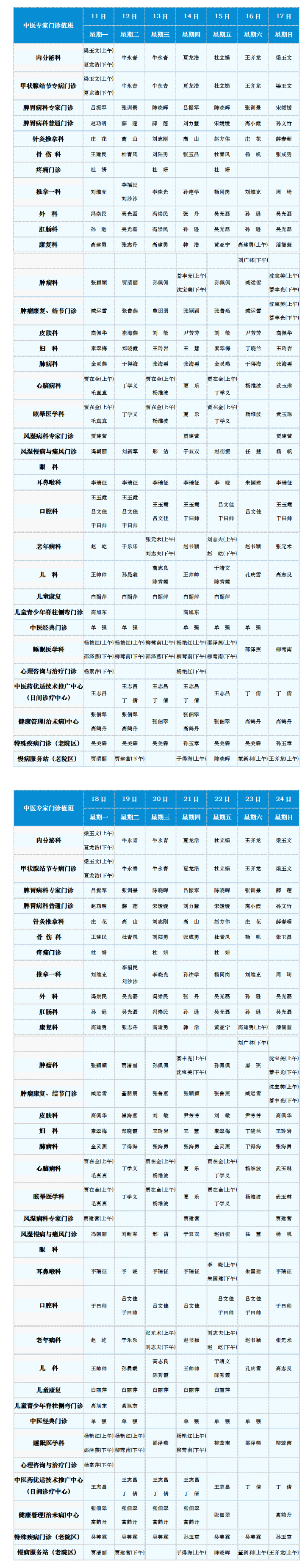 中医专家门诊值班表