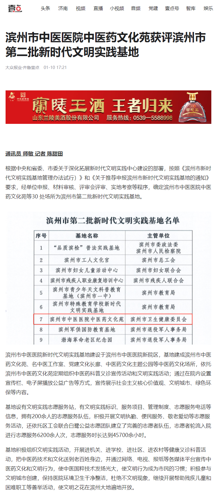 【齐鲁壹点】滨州市中医医院中医药文化苑获评滨州市第二批新时代文明实践基地
