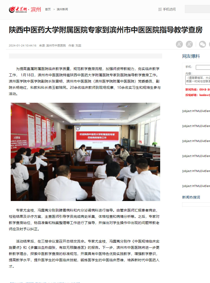 【大众网】陕西中医药大学附属医院专家到滨州市中医医院指导教学查房