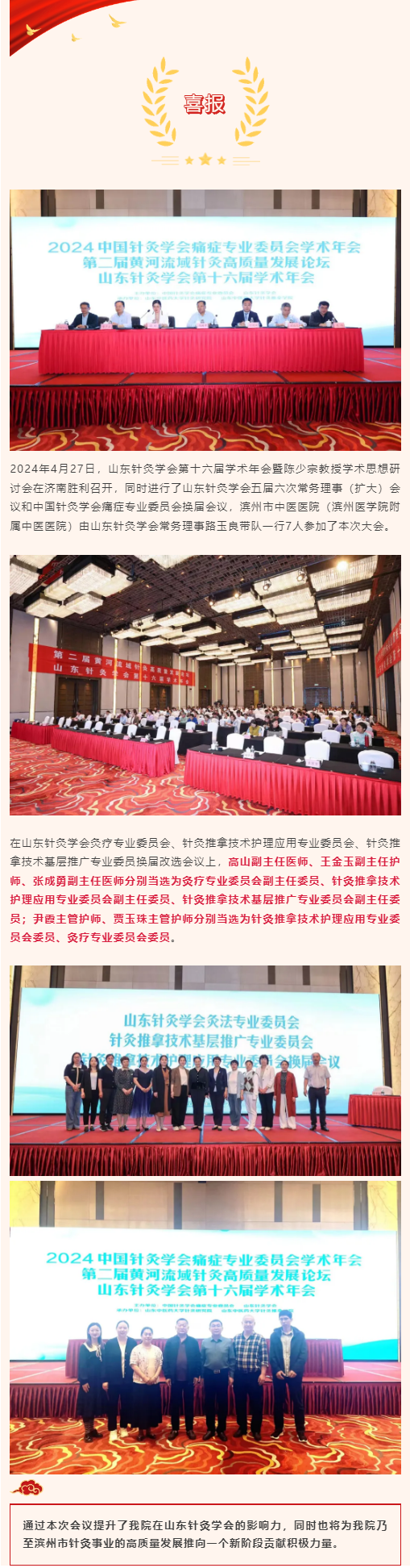 喜报|滨州市中医医院(滨州医学院附属中医医院)在2024山东针灸学会第十六届学术年会上3人当选为相关专业委员会副主任委员