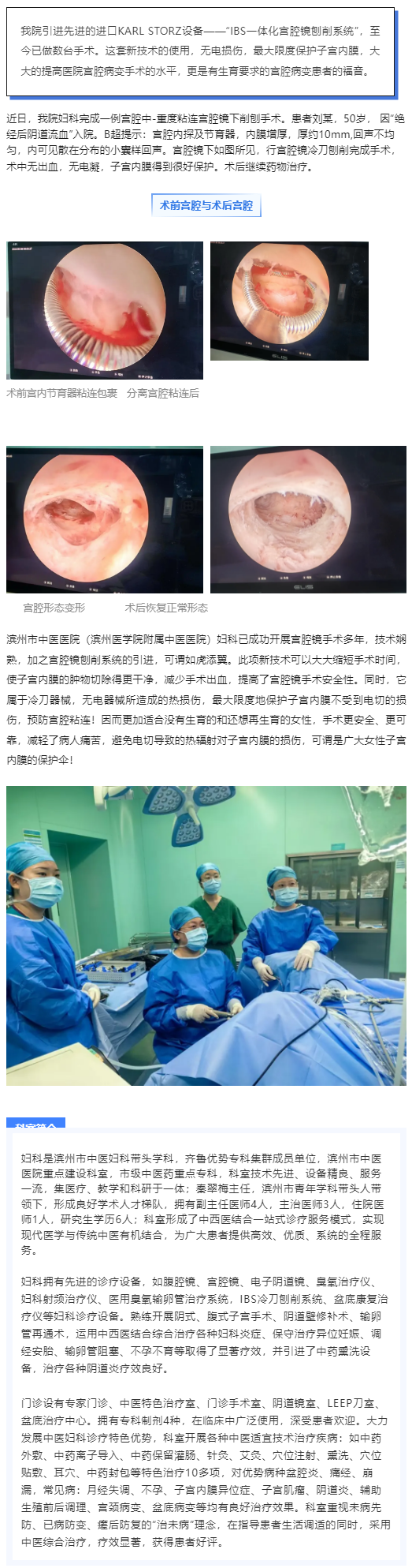 滨州市中医医院(滨州医学院附属中医医院)妇科开展新技术——宫腔镜下刨削术