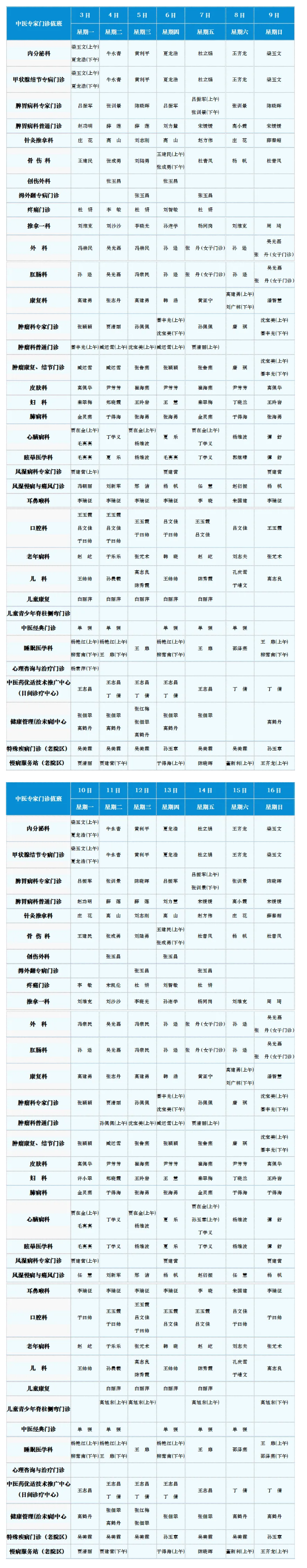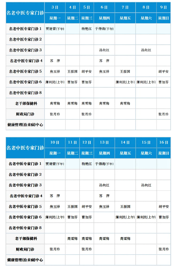 中医专家门诊值班表