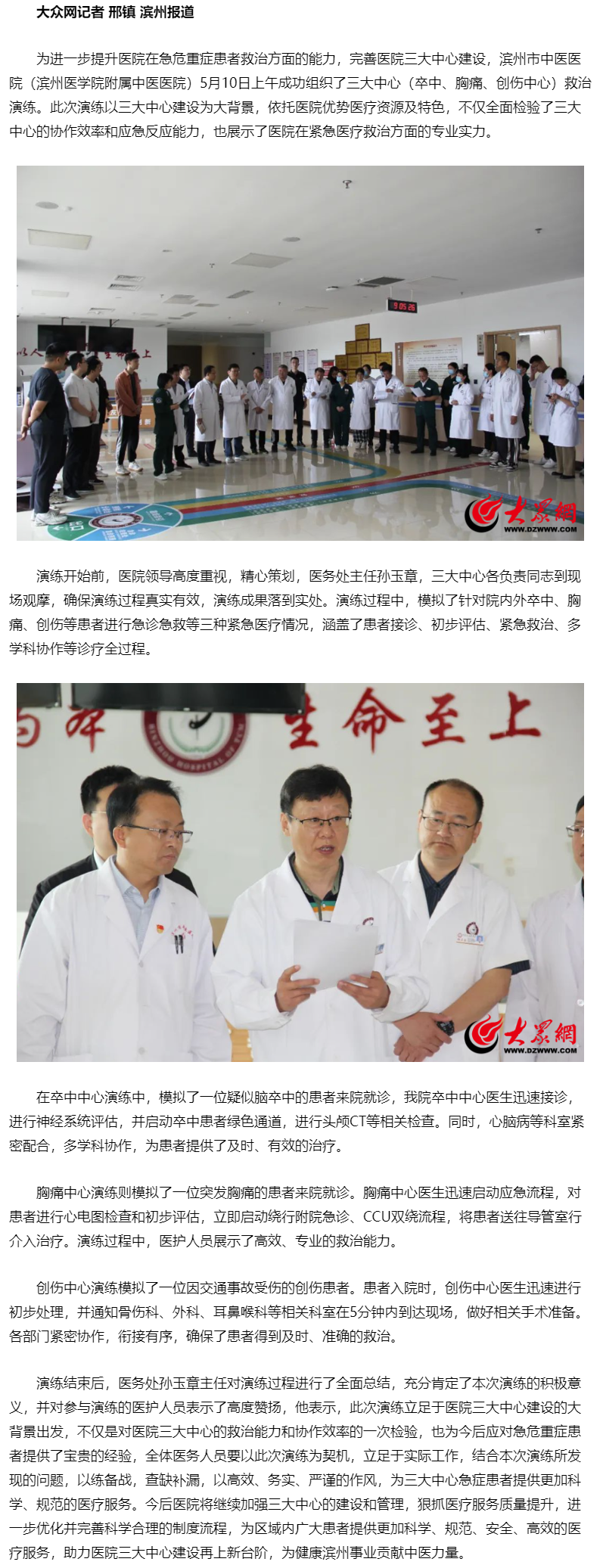 【大众网】滨州市中医医院(滨州医学院附属中医医院)组织卒中、胸痛、创伤中心三大中心进行救治演练