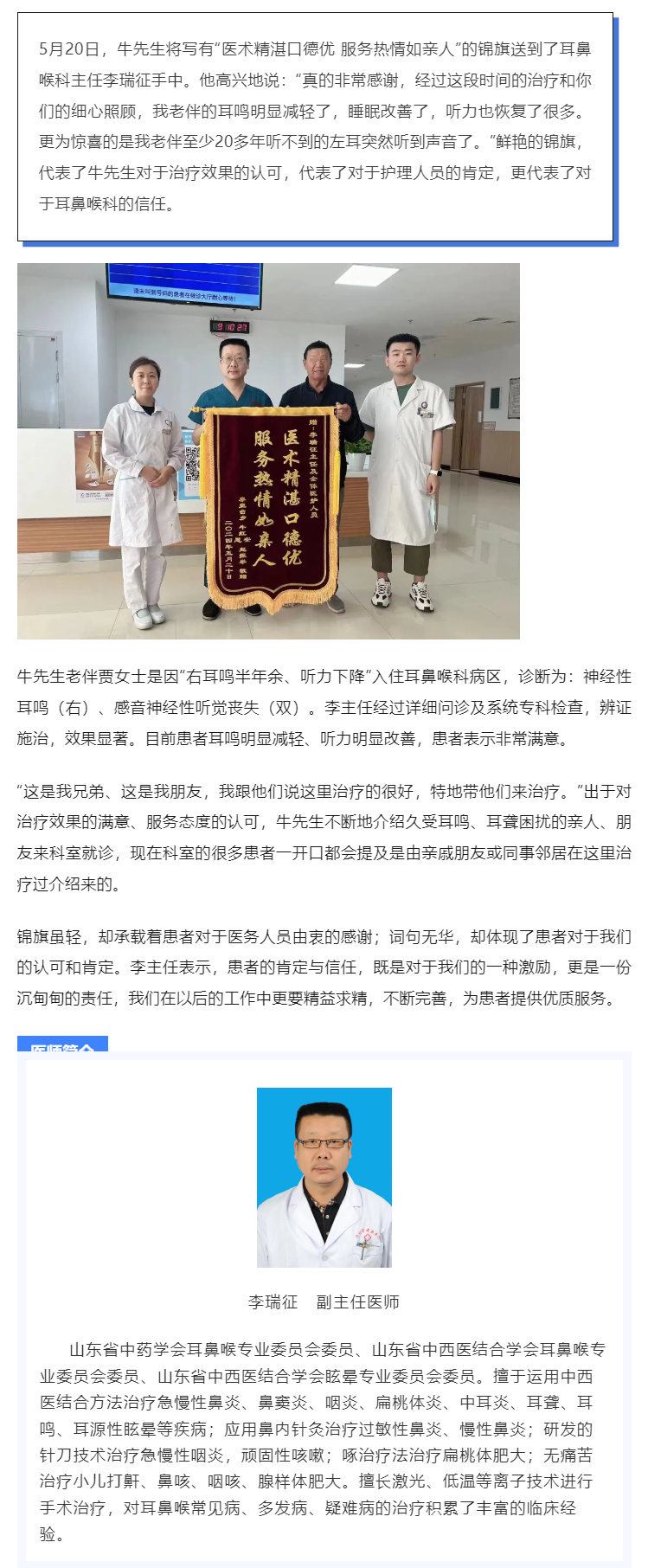 锦旗故事 | 特色技术治耳鸣,暖心服务助康健——耳鼻喉科