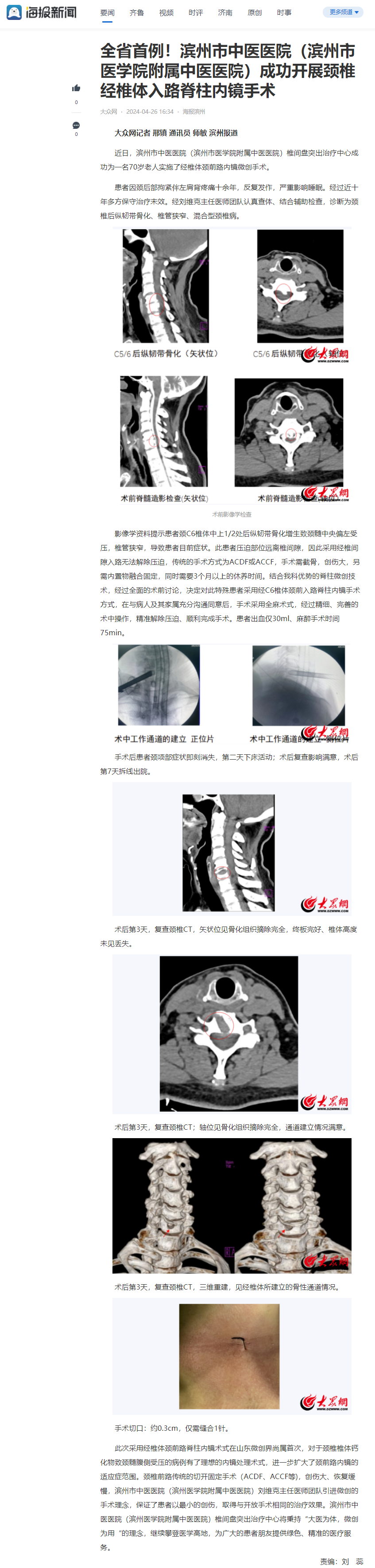 【海报新闻】全省首例!滨州市中医医院(滨州市医学院附属中医医院)成功开展颈椎经椎体入路脊柱内镜手术