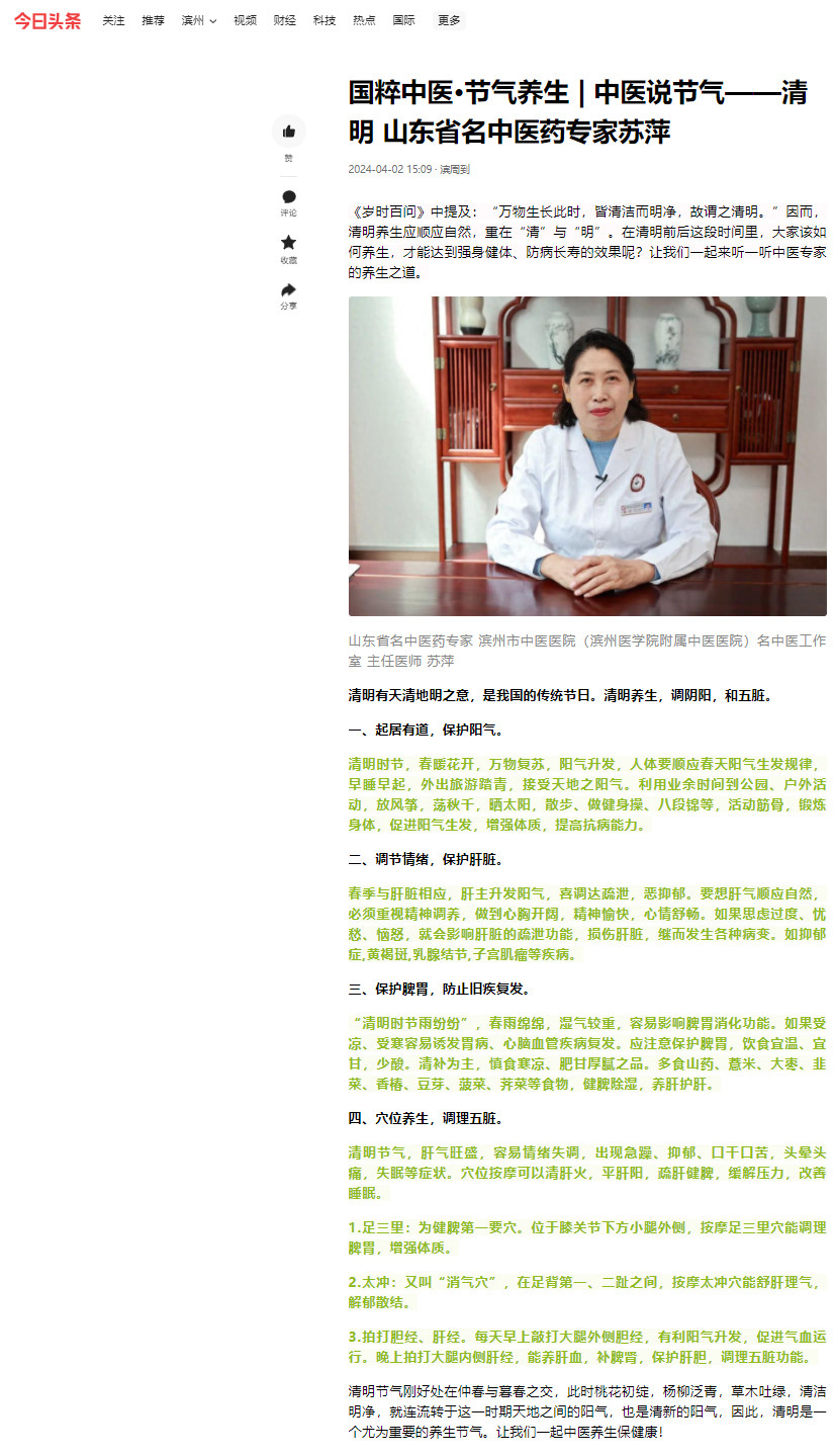【滨周到头条号】国粹中医·节气养生 | 中医说节气——清明 山东省名中医药专家苏萍