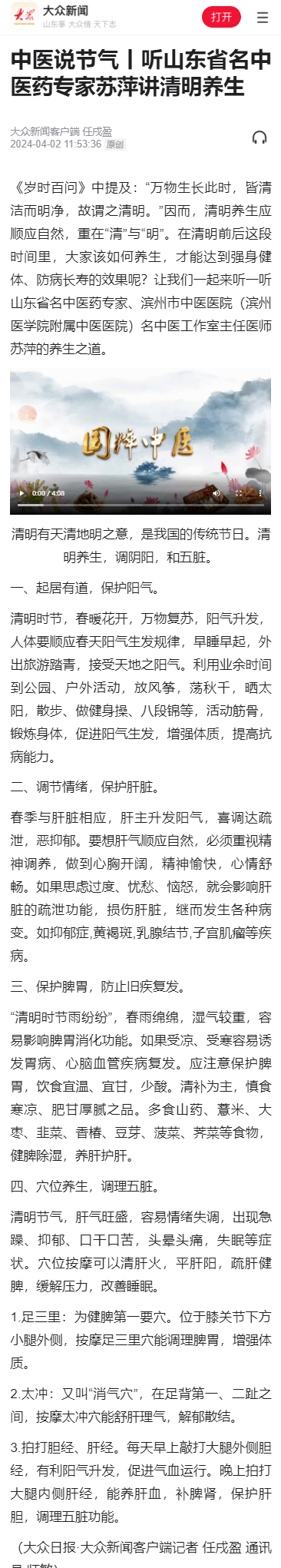 【大众新闻】中医说节气丨听山东省名中医药专家苏萍讲清明养生