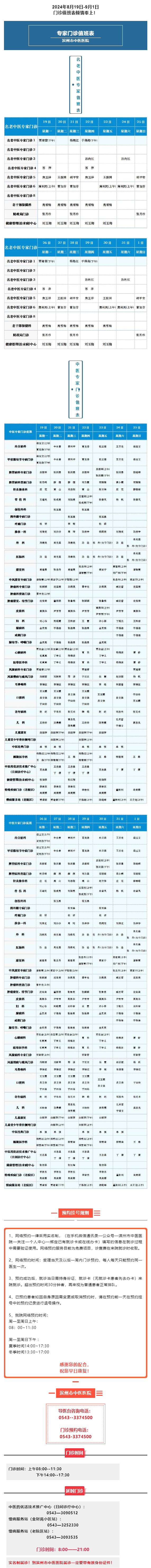 滨州市中医医院(滨州医学院附属中医医院)2024年8月19日-9月1日门诊值班表
