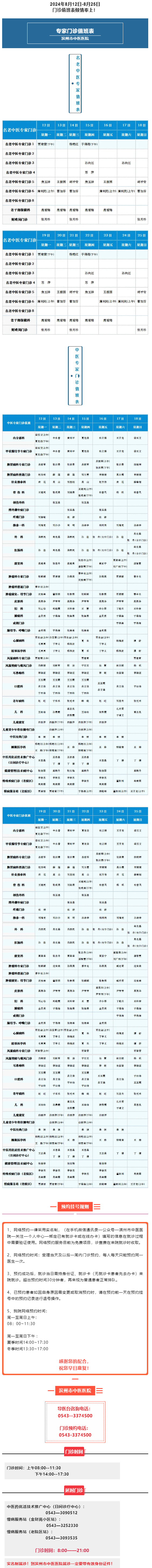 滨州市中医医院(滨州医学院附属中医医院)2024年8月12日-8月25日门诊值班表
