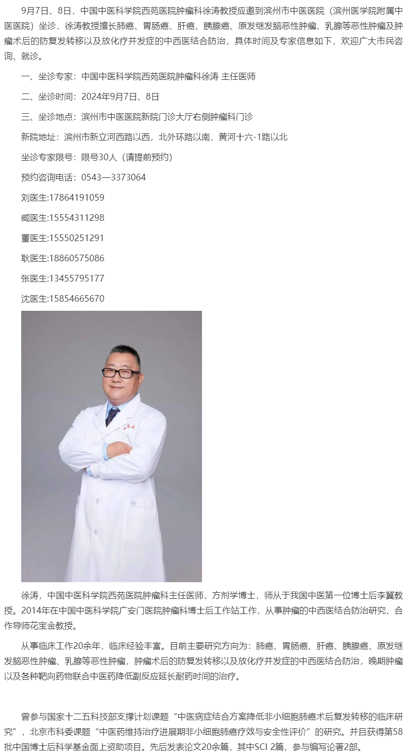 【齐鲁壹点】9月7日—8日,滨州市中医医院特邀肿瘤专家徐涛到院坐诊