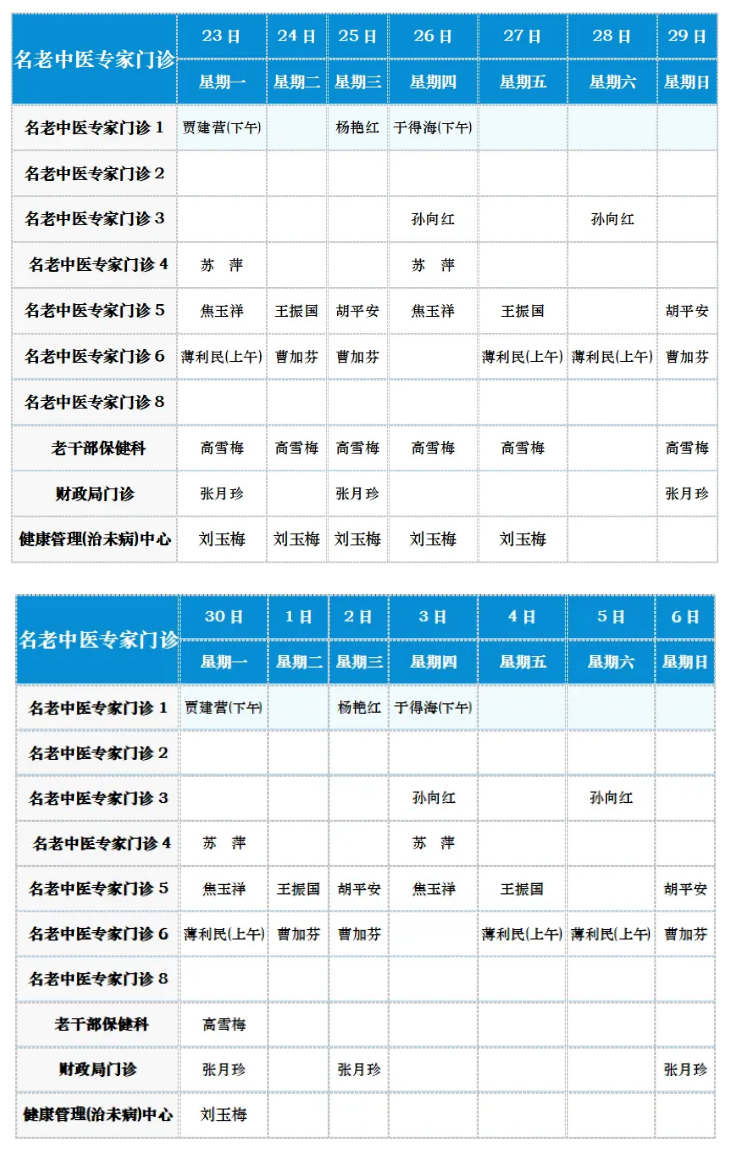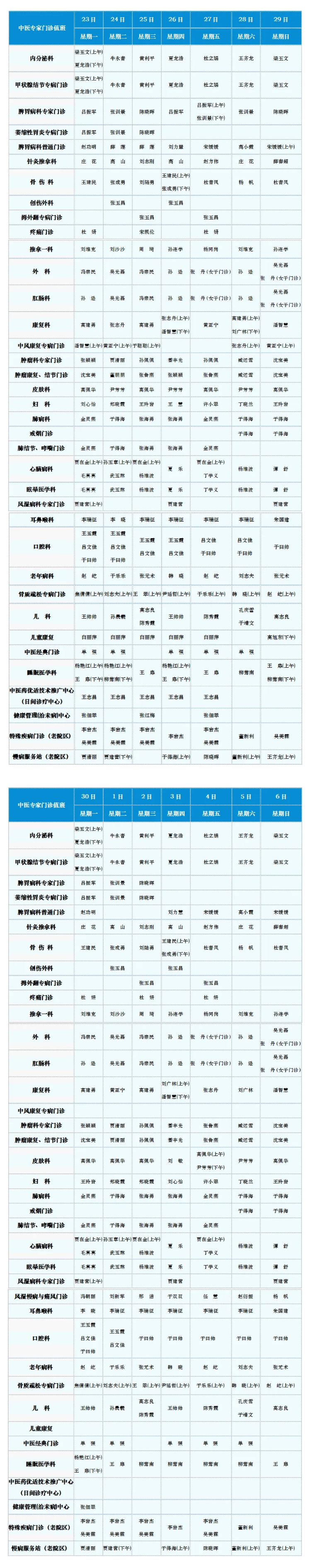 中医专家门诊值班表