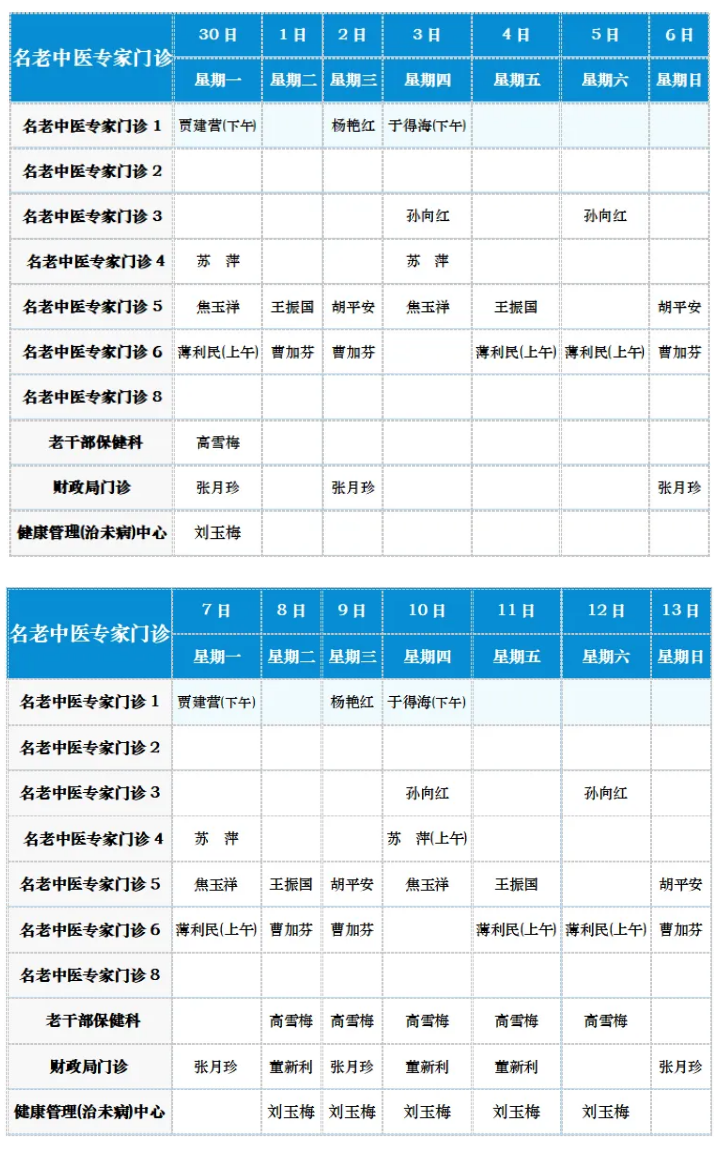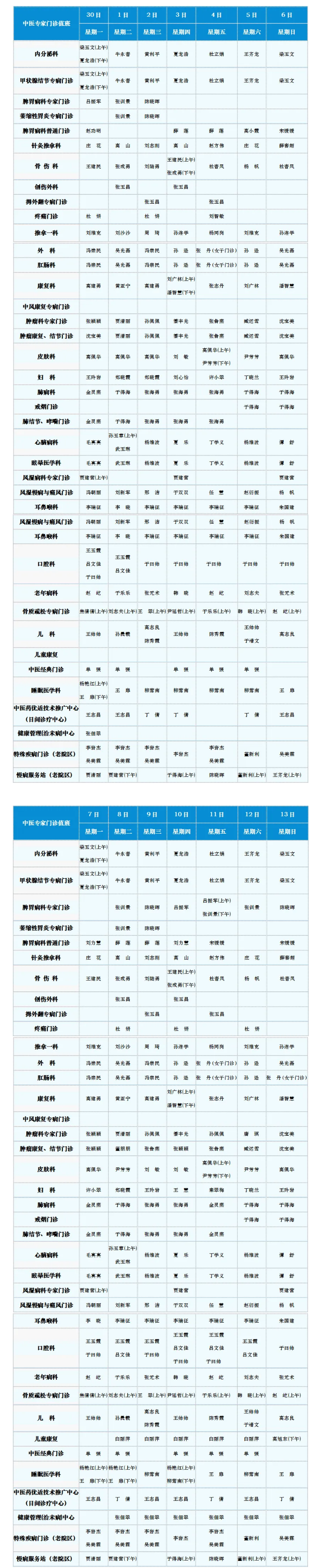 中医专家门诊值班表