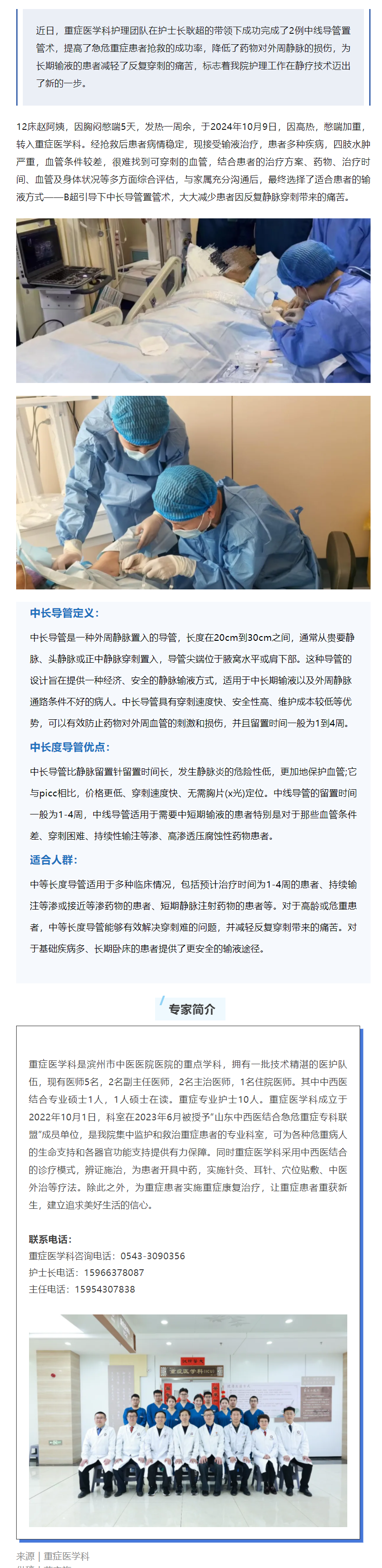 滨州市中医医院(滨州医学院附属中医医院)重症医学科首例中线导管成功置入