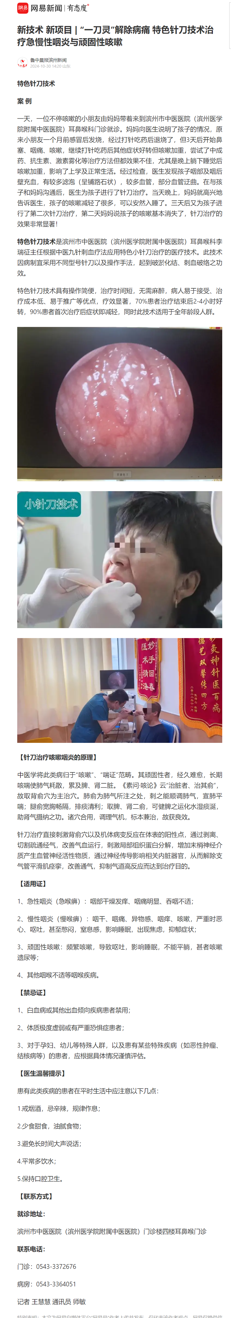 【鲁中晨报滨州新闻网易号】新技术 新项目 | “一刀灵”解除病痛 特色针刀技术治疗急慢性咽炎与顽固性咳嗽