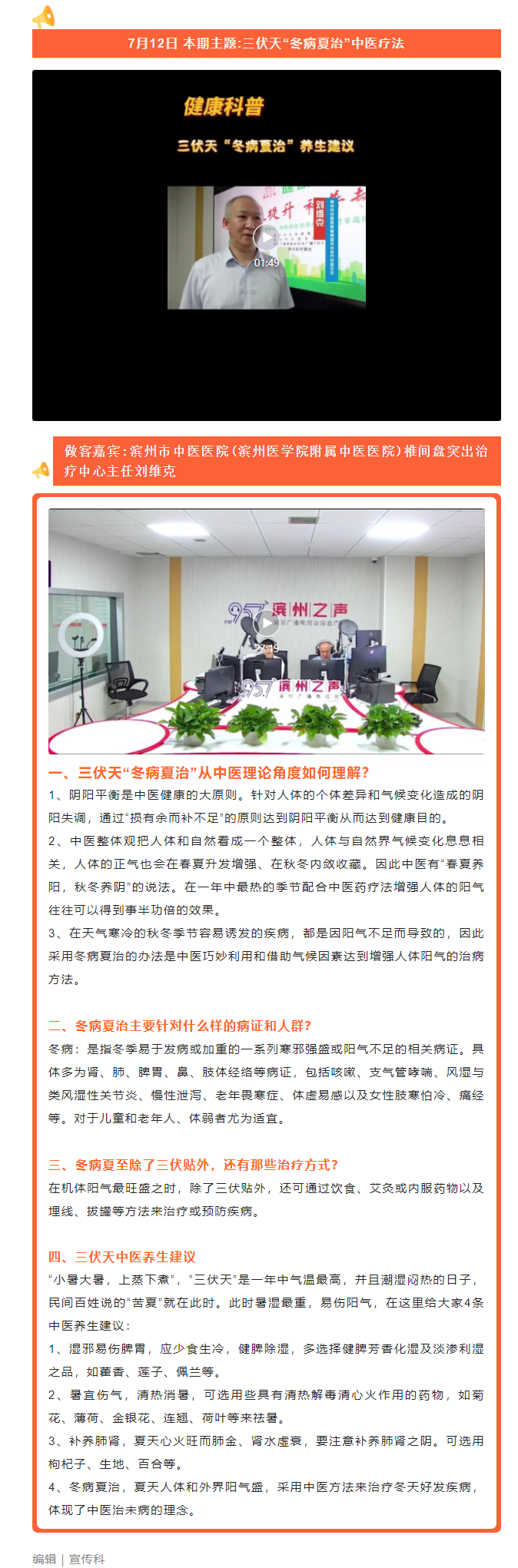 中医药文化服务月 | 健康访谈——滨州市中医医院椎间盘突出治疗中心主任刘维克做客直播间 科普三伏天“冬病夏治”中医疗法