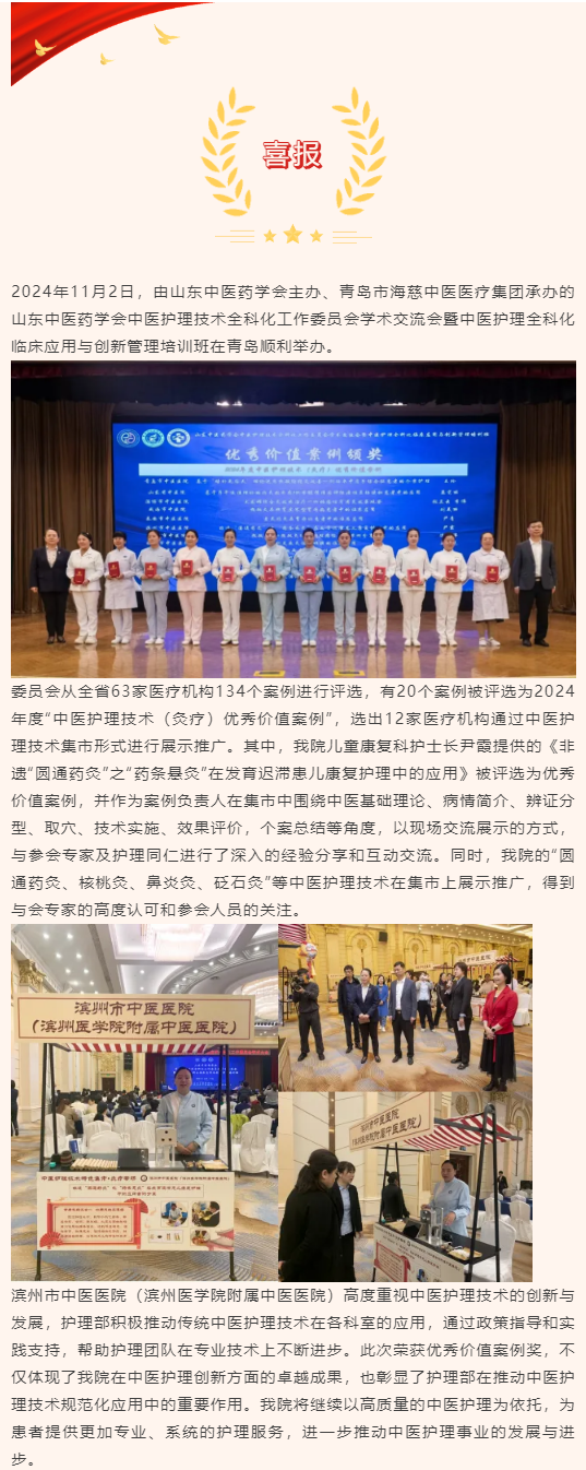 喜报 | 滨州市中医医院入选山东省中医护理技术全科化工作委员会优秀价值案例并分享交流