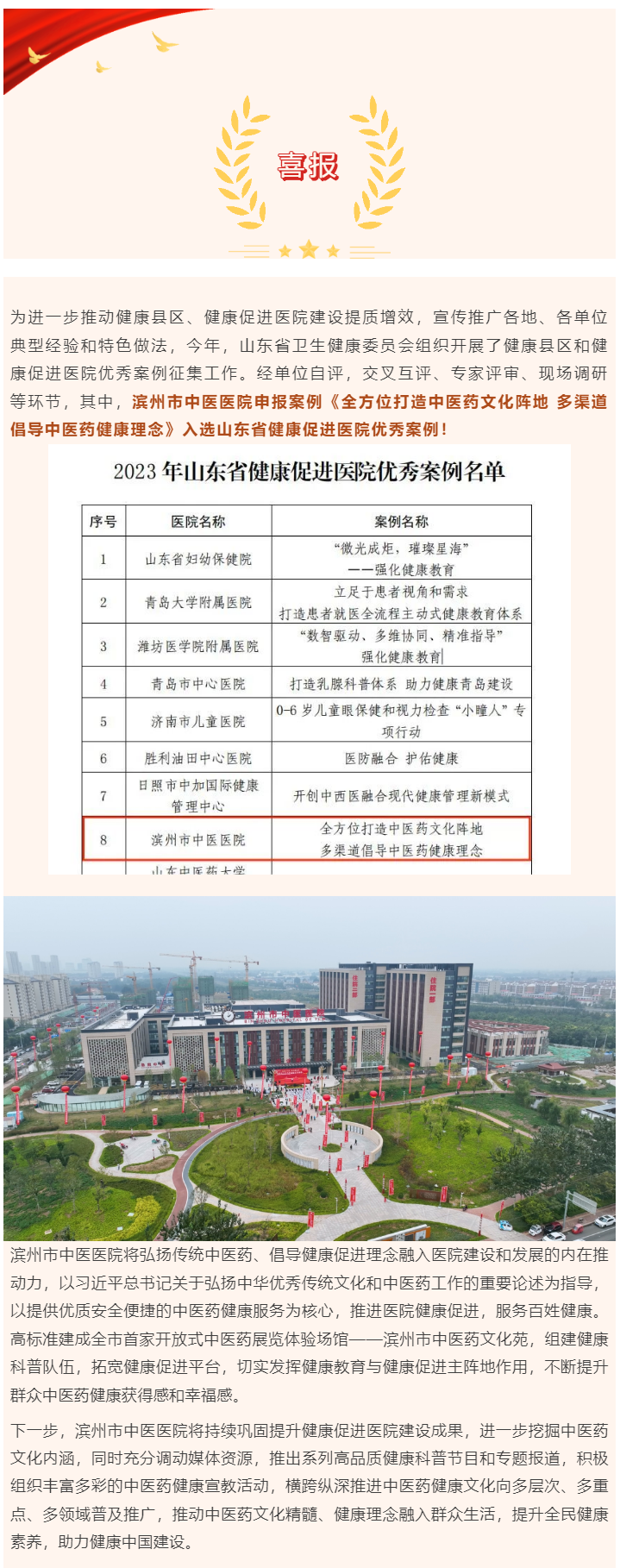 喜报 | 滨州市中医医院获评2023年山东省健康促进医院优秀案例