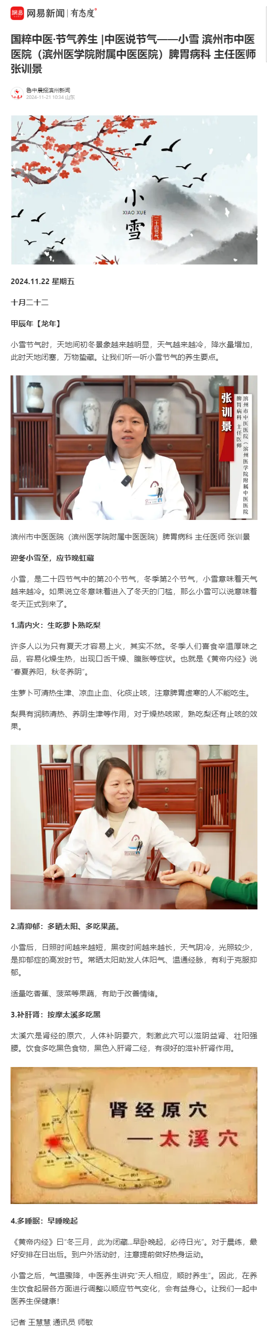 【鲁中晨报滨州新闻】国粹中医·节气养生 |中医说节气——小雪 滨州市中医医院(滨州医学院附属中医医院)脾胃病科 主任医师 张训景