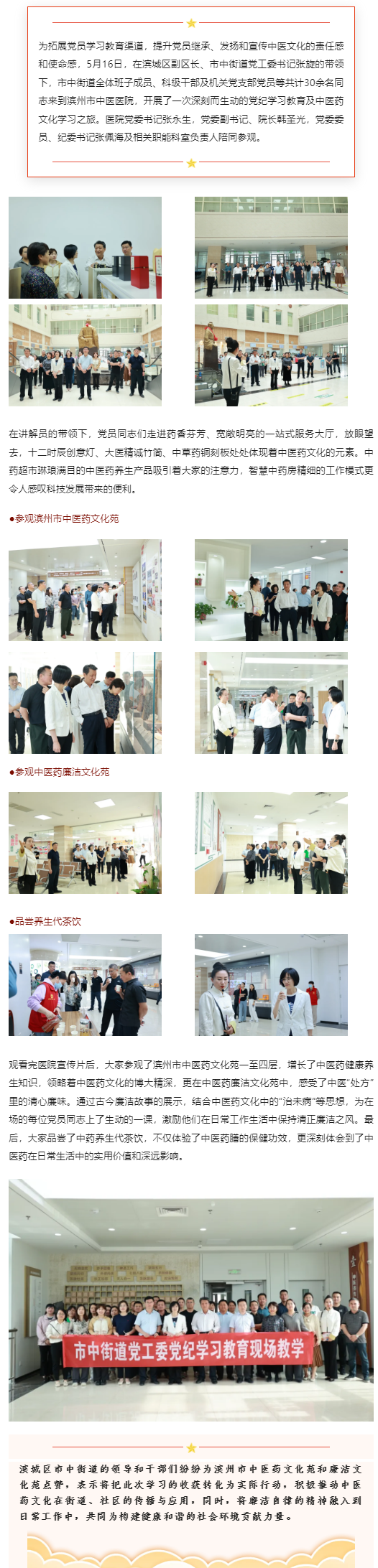 滨城区副区长、市中街道党工委书记张旋带领30余名市中街道党员参观滨州市中医药文化苑及中医药廉洁文化苑