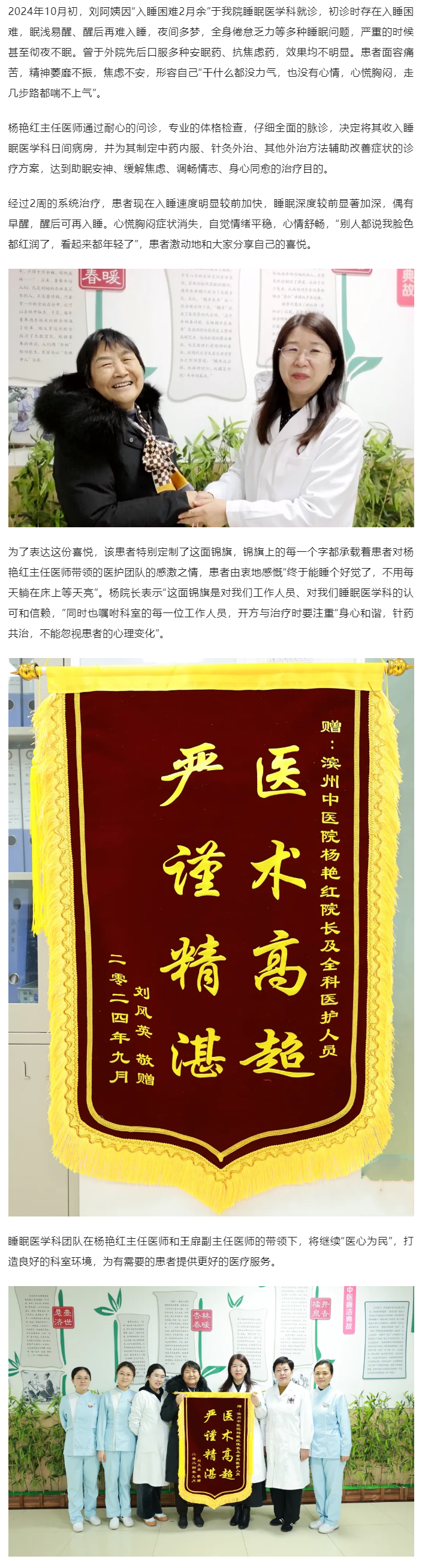 2024年12月5日滨州市中医医院(滨州医学院附属中医医院)睡眠医学科收到了一幅鲜亮的锦旗。这面写着“医术高超,严谨精湛”的锦旗不仅反映了患者身心向愈的喜悦和感激之情,更反映了院长带领的医疗团队精湛的医术和高尚的医德。