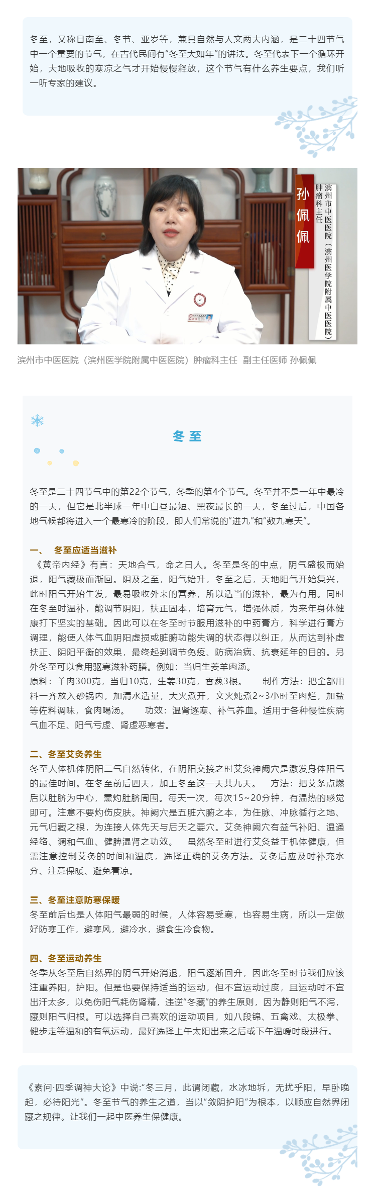 国粹中医 · 节气养生 | 中医说节气—冬至 滨州市中医医院(滨州医学院附属中医医院)肿瘤科主任 副主任医师 孙佩佩