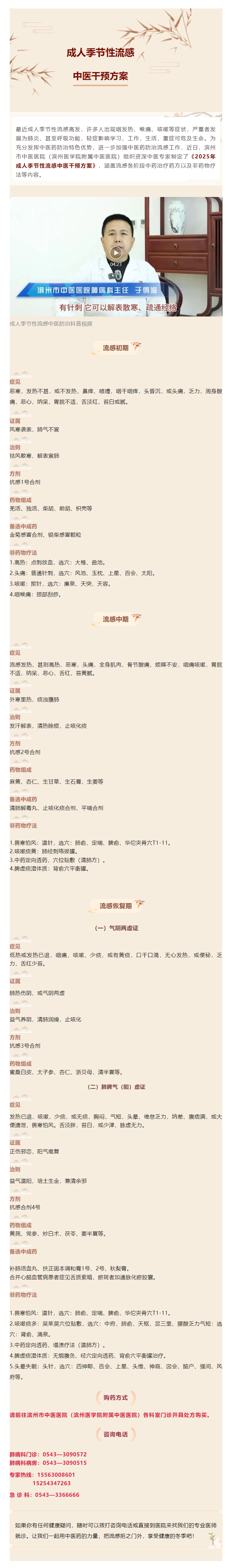 滨州市中医医院(滨州医学院附属中医医院)2025年成人季节性流感中医干预方案