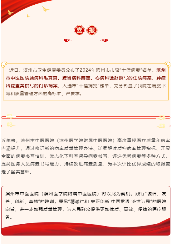 喜报 | 2024年滨州市市级“十佳病案”名单公布 滨州市中医医院(滨州医学院附属中医医院)获奖+4!