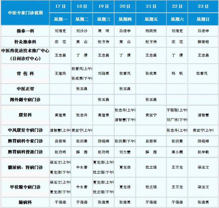 滨州市中医医院(滨州医学院附属中医医院)2025年2月17日-2月23日门诊值班表