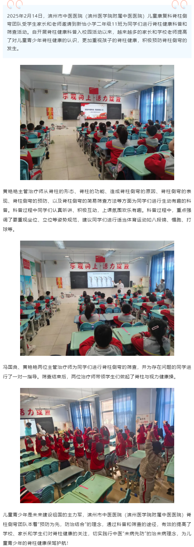 滨州市中医医院(滨州医学院附属中医医院)儿童康复科脊柱侧弯团队进校园科普及筛查