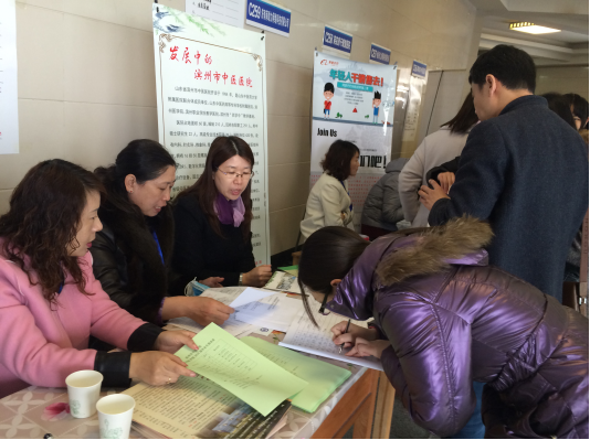 2016年我院以“解放思想,转变观念,创新途径,拓宽渠道”为引进人才指导思想,积极深入高校进行校园现场招聘。2016年3月12日由分管人事工作的副院长杨艳红同志带队一行五人参加了滨州医学院服务“蓝黄”两区医药专场暨滨州医学院2016年毕业生供需洽谈会。共收到符合我院招聘计划有意向毕业生57人,其中硕士研究生13人、本科生39人、专科生5人,现场签订协议书4人。