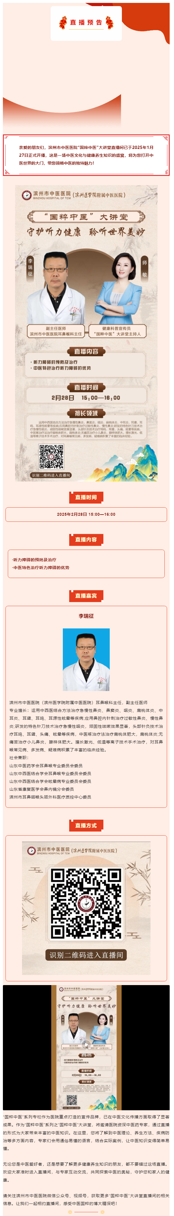 直播预告 | 滨州市中医医院(滨州医学院附属中医医院)“国粹中医”大讲堂第五期 守护听力健康,聆听世界美妙