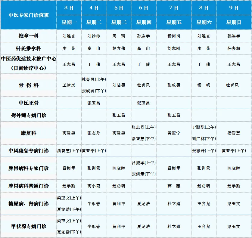 滨州市中医医院(滨州医学院附属中医医院)2025年3月3日-3月9日门诊值班表