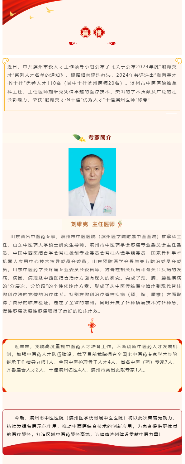 喜报 | 滨州市中医医院刘维克主任荣获“渤海英才·N十佳”优秀人才“十佳滨州医师”称号