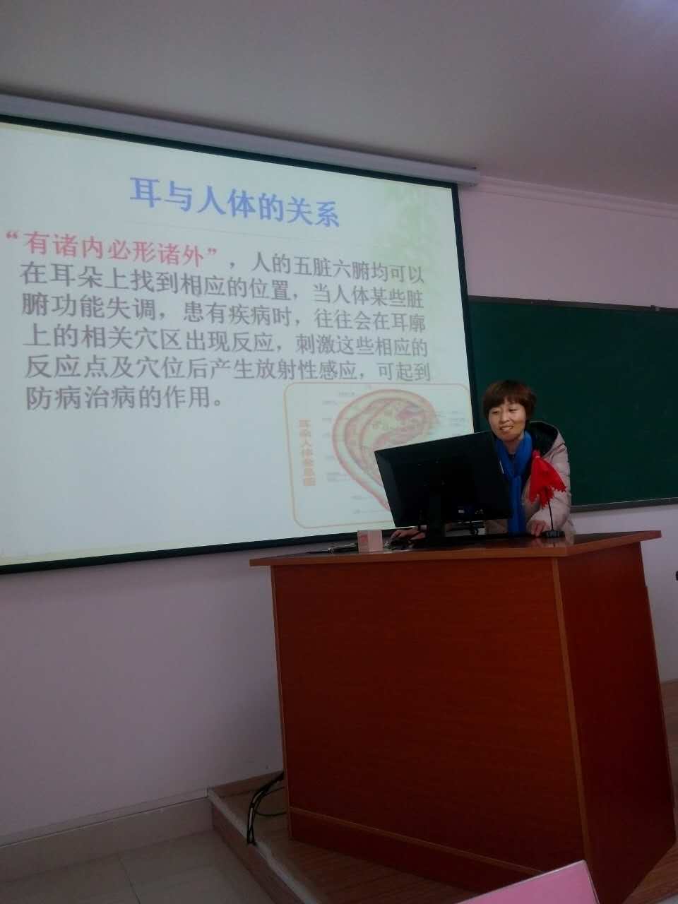 3月8日、老年大学活动中心示教室坐满了老年大学生,曾获得滨州市中医药系统中医护理技能竞赛一等奖的我院护士韩岩峰、首先给老人们普及耳穴压豆的理论及养生保健知识,倡导中医护理特色与优势,然后示范观摩,让老人们亲身体验、操作,激发了大家的兴趣和热情,现场欢声笑语,气氛热烈,老人朋友们纷纷表示,参加健康讲座学到了中医养生保健知识,又亲身体验了耳穴压豆的神奇疗效,非常高兴,希望能多有一些这样的健康讲座。