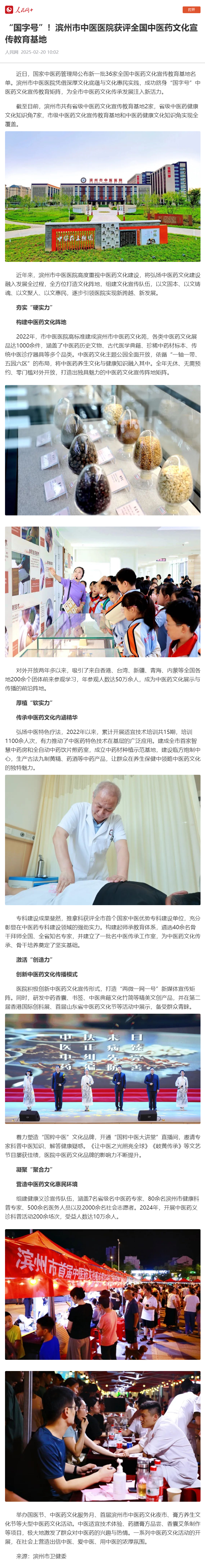 【人民网】“国字号”!滨州市中医医院获评全国中医药文化宣传教育基地