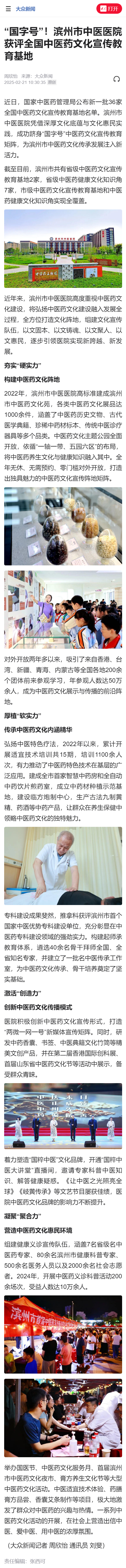 【大众新闻】“国字号”!滨州市中医医院获评全国中医药文化宣传教育基地