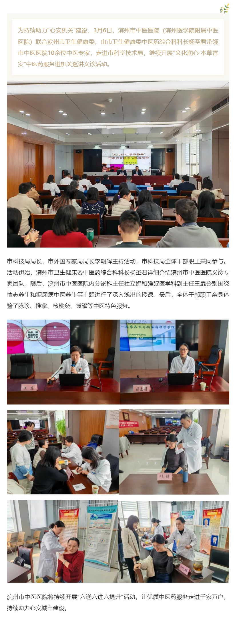 滨州市中医医院(滨州医学院附属中医医院)持续开展“文化润心·本草香安”中医药服务进机关巡讲义诊活动