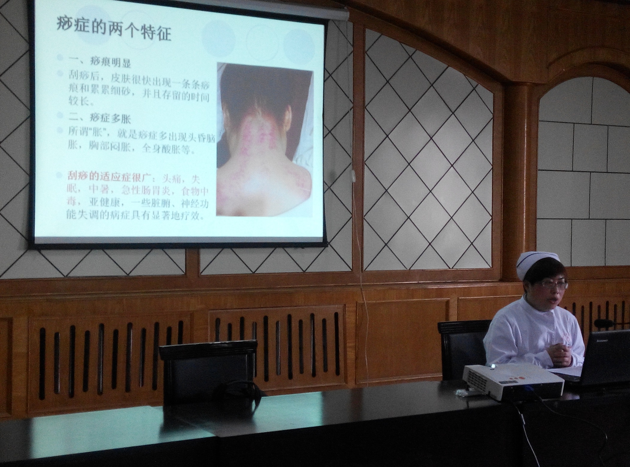 3月21日,在门诊楼四楼会议室由内二科护士长单茜给我院护理人员进行中医护理新技术刮痧专项培训。