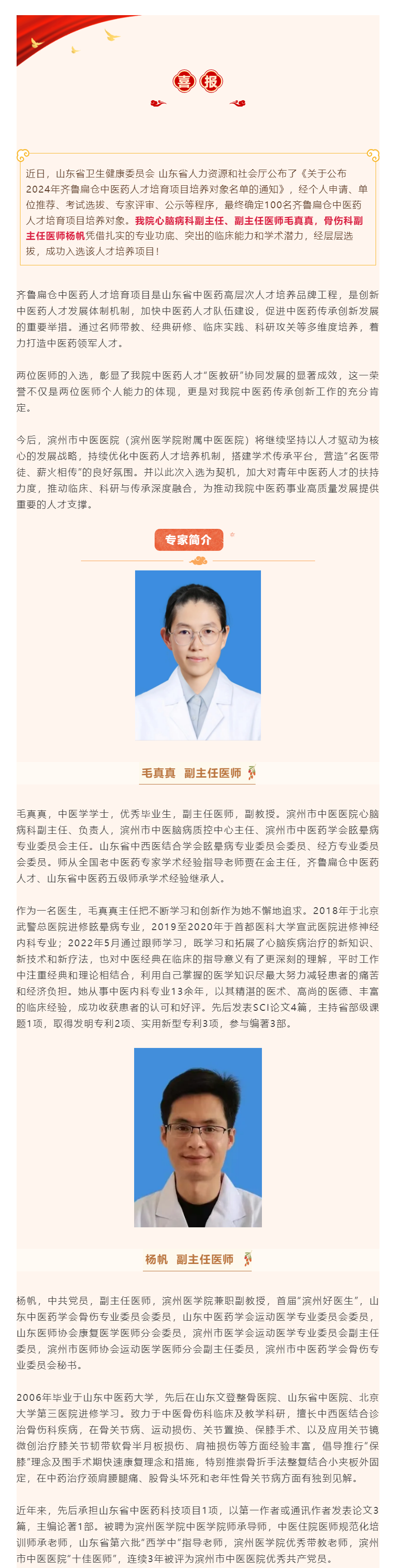 喜报 | 祝贺滨州市中医医院(滨州医学院附属中医医院)2人入选齐鲁扁仓中医药人才培育项目培养对象