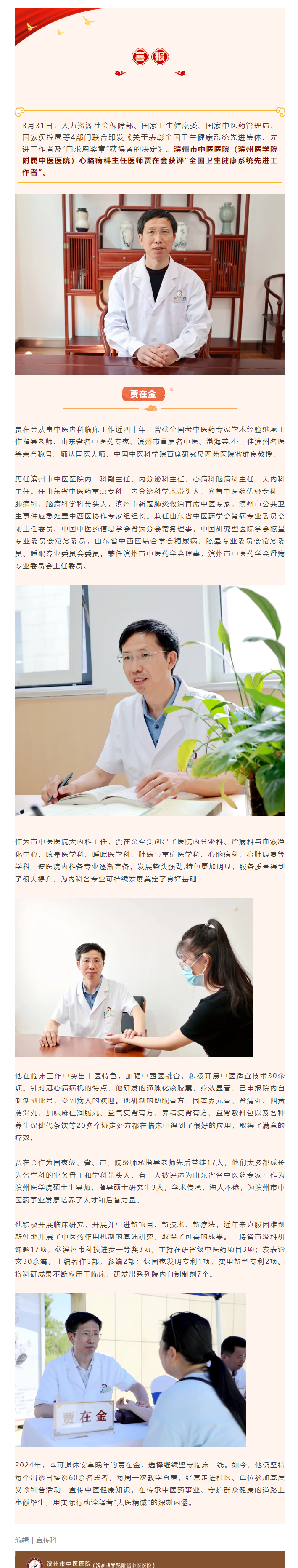 喜报 | 滨州市中医医院(滨州医学院附属中医医院)贾在金医师获评“全国卫生健康系统先进工作者”