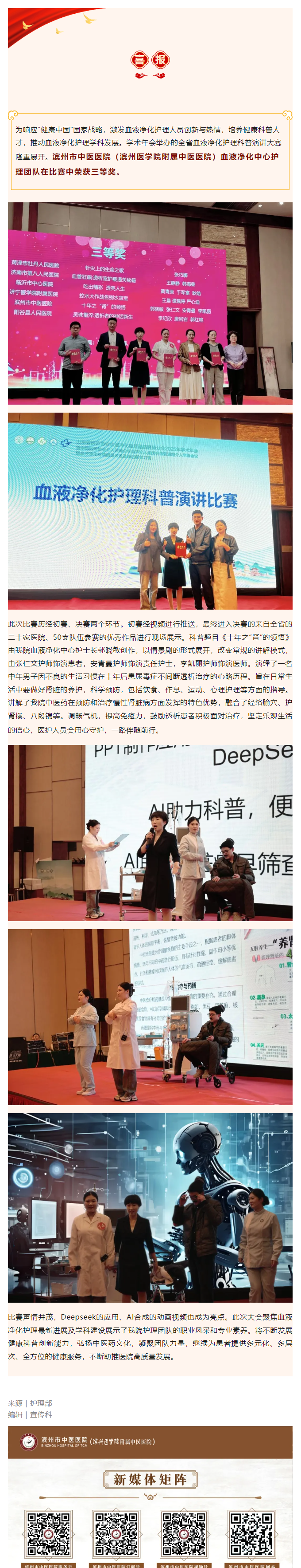 喜报 | 滨州市中医医院(滨州医学院附属中医医院)护理团队在山东省医师协会血管通路医生分会血液净化护理科普演讲大赛中荣获三等奖