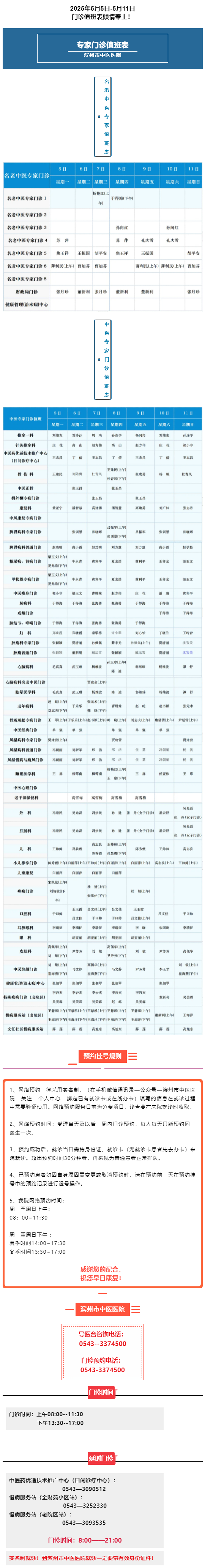 滨州市中医医院(滨州医学院附属中医医院)2025年5月5日-5月11日门诊值班表