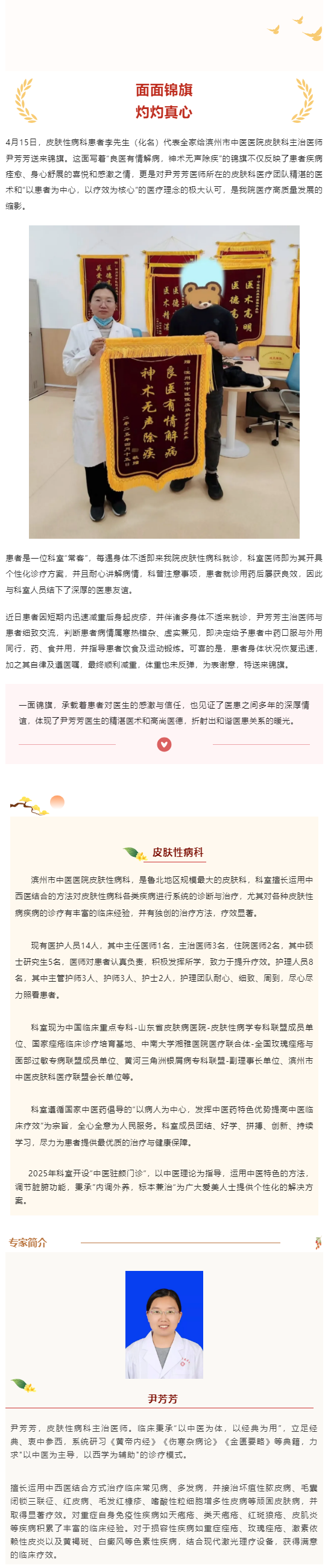 锦旗故事 | 良医有情解病 神术无声除疾——皮肤性病科尹芳芳医师收到感谢锦旗