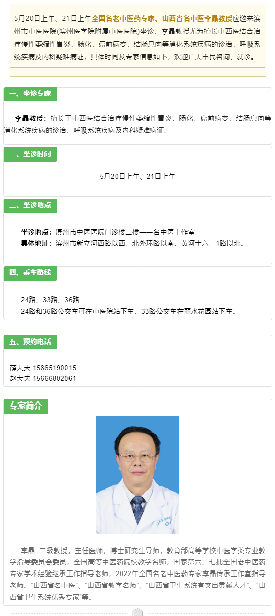 【呼吸、消化专家】5月20日上午、21日上午全国名老中医药专家、山西省名中医李晶教授来院坐诊,预约从速!